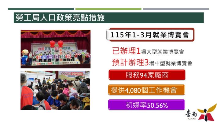預計2026年辦理4場大型就業博覽會及3場中型就業博覽會。2026年至3月底共辦理1場大型就業博覽會,服務94家廠商,提供4,080個工作機會。